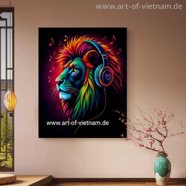 Artikel D0104 - Neon Löwe im Musikrausch | Druck auf Leinwand