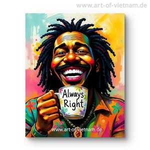 Größe: In mehreren Größen erhältlich bzw. zu bestellen. Farbenfrohes Statement für Optimismus. Ein täglicher Motivationsschub für Ihre Wände. Dieses ausdrucksstarke, illustrative Porträt strahlt eine unbändige Energie und Gelassenheit aus. Ein lachender Mann mit markanten Dreadlocks hält eine Kaffeetasse mit der Aufschrift „Always Right“ in den Händen – ein Augenzwinkern in Richtung Selbstvertrauen und gute Laune. Die lebendige Farbpalette im Hintergrund macht dieses Werk zu einem echten Highlight in jeder modernen Einrichtung.